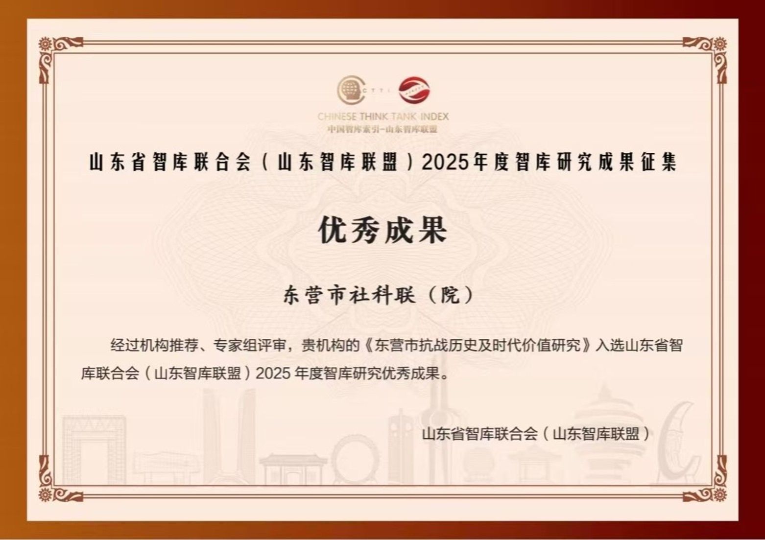 12月6日,山东省智库联合会(山东智库联盟)2025年年会在济南召开,公布了山东智库联盟智库建设优秀案例10个、智库研究优秀成果32个。我校马克思主义学院尹健教师团队主持的东营市社会科学规划重大课题《东营市抗战历史及时代价值研究》,入选山东省智库联合会(山东智库联盟)2025年度智库研究优秀成果。
